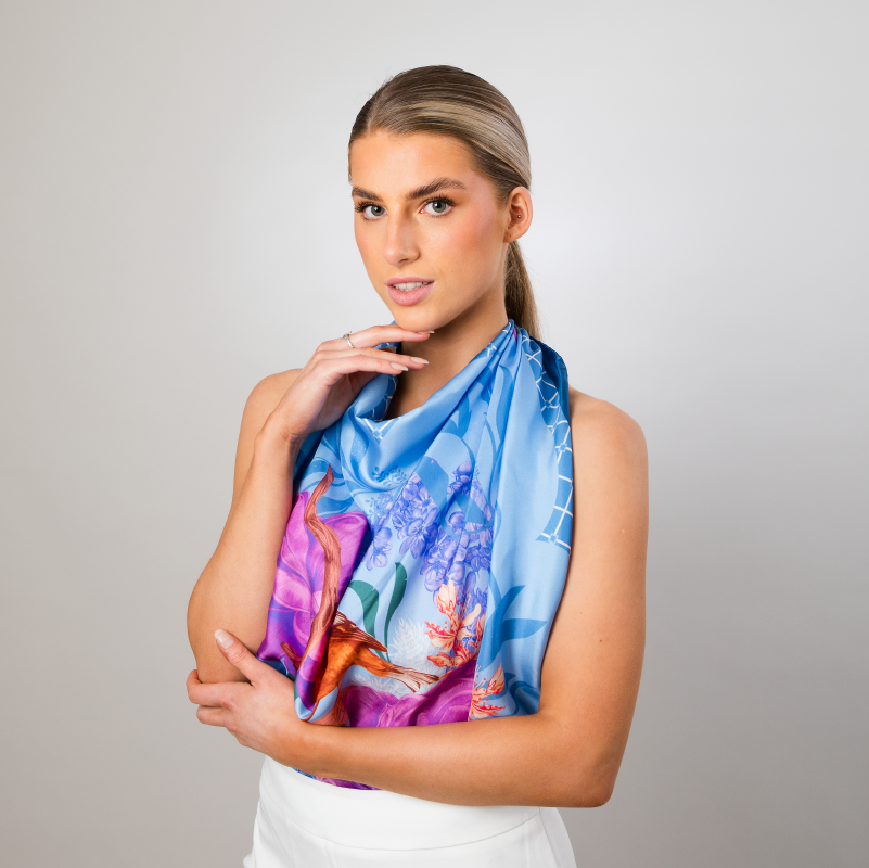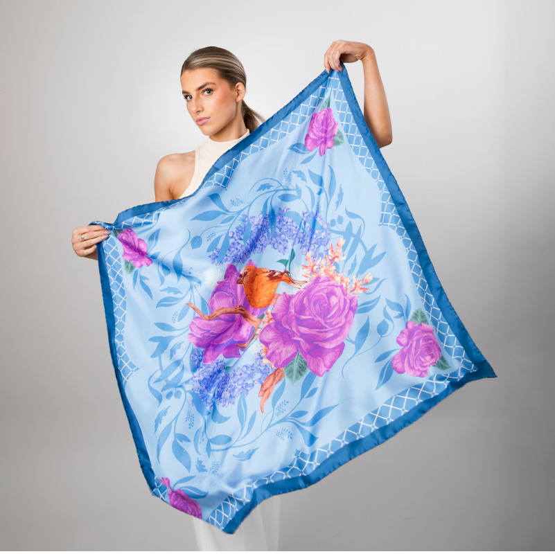 The Powder Blue Josephine Silk Scarf is part of the wider collection, My Granny's Garden and is inspired by childhood trips to County Clare, in the West of Ireland.