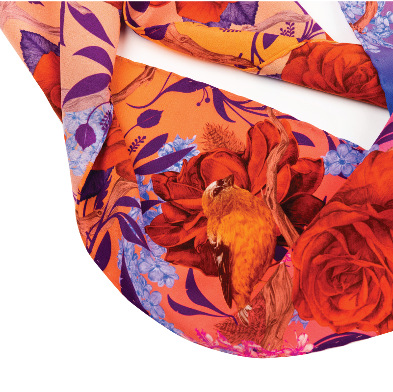 It features various botanicals, including the wild Irish Rose, representing the strength and resilience of Irish women, both past and present. This silk treasure also features a curious chaffinch, a frequent visitor to Ireland.
