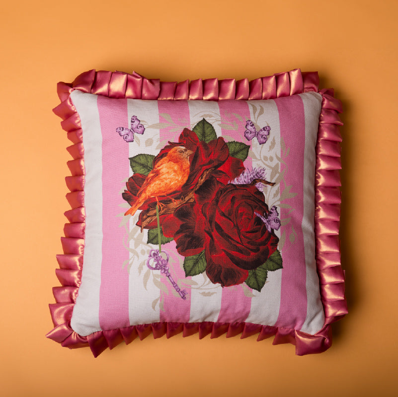 Romantic Ruffles & Roses Cushion – Pink Parisian Stripes (Lands April)